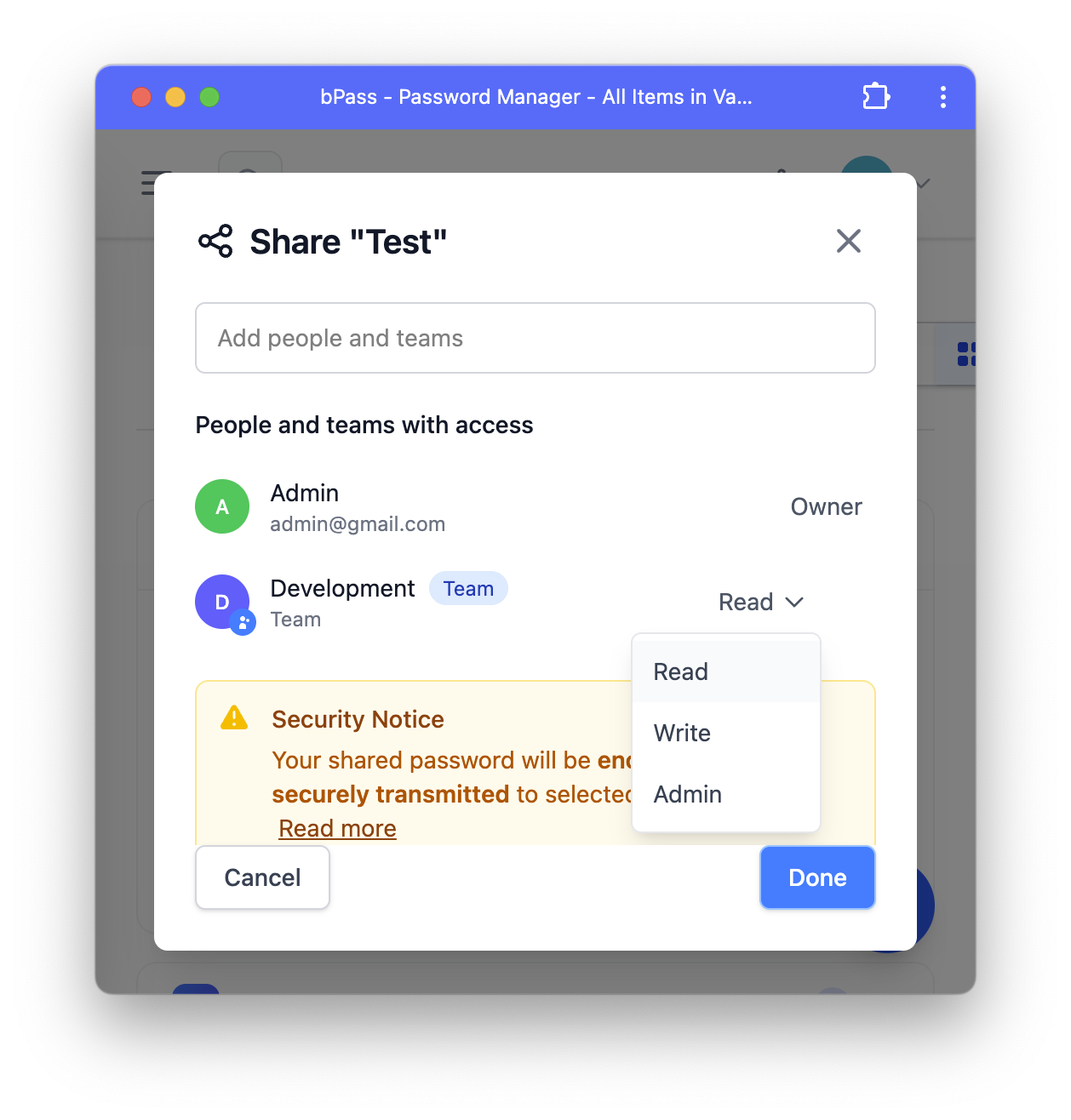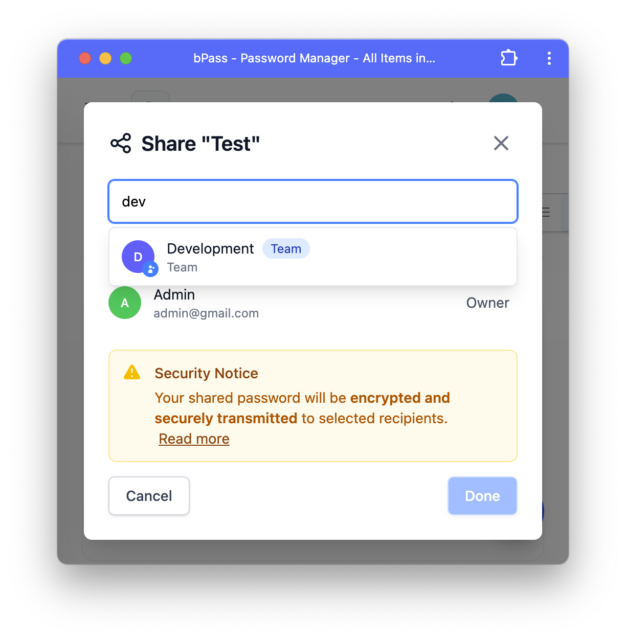 Team sharing allows you to securely share vault entries with all members of your team. This is ideal for sharing common credentials, documents, or other sensitive information that multiple team members need access to.