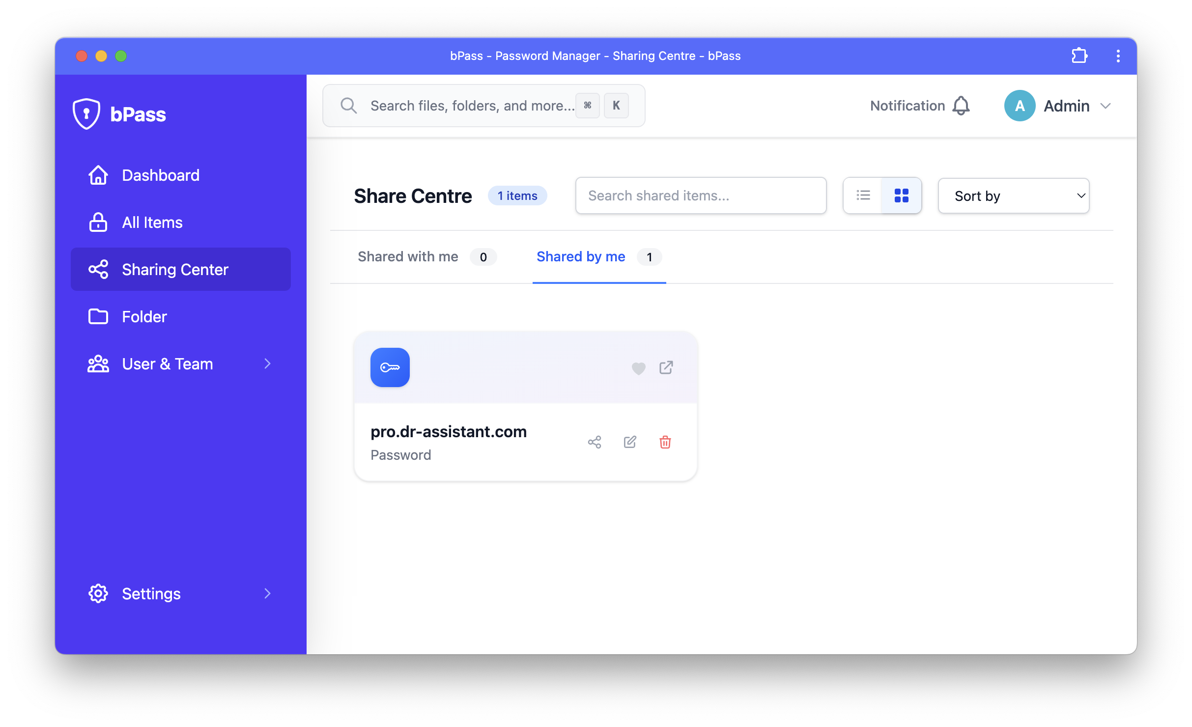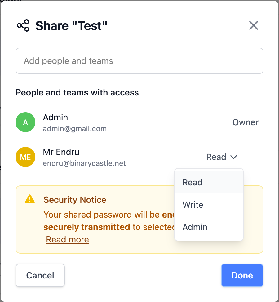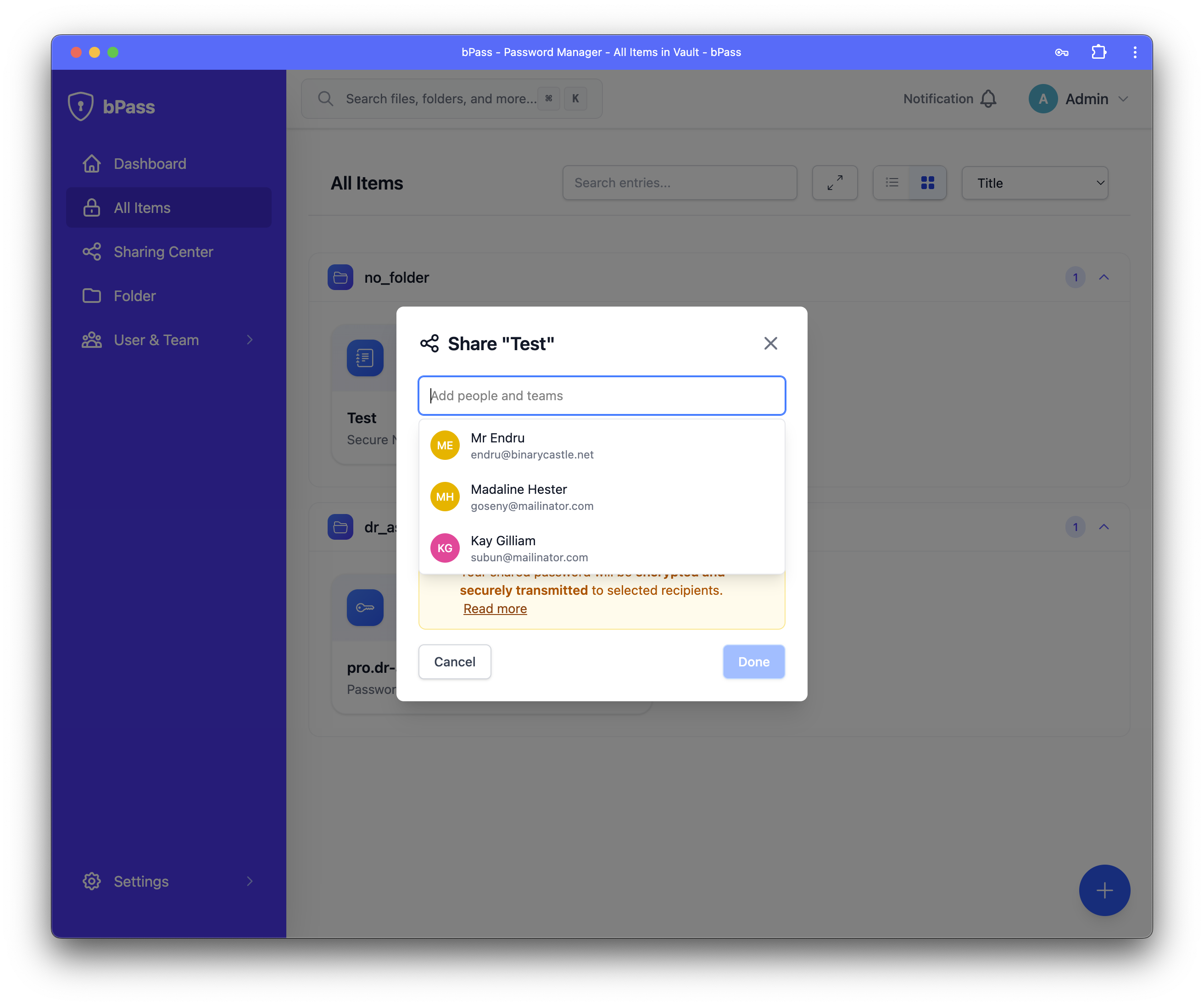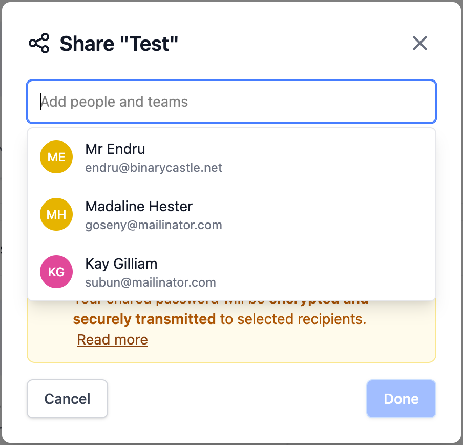 User sharing allows you to securely share individual vault entries with specific users in your organization. This feature enables selective collaboration while maintaining granular control over who can access your sensitive information.