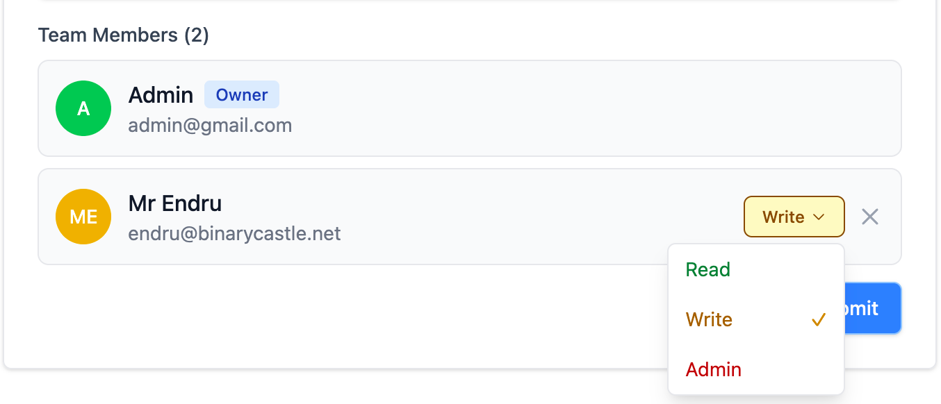 - Admin: Can view, edit, and manage vault entries plus team settings